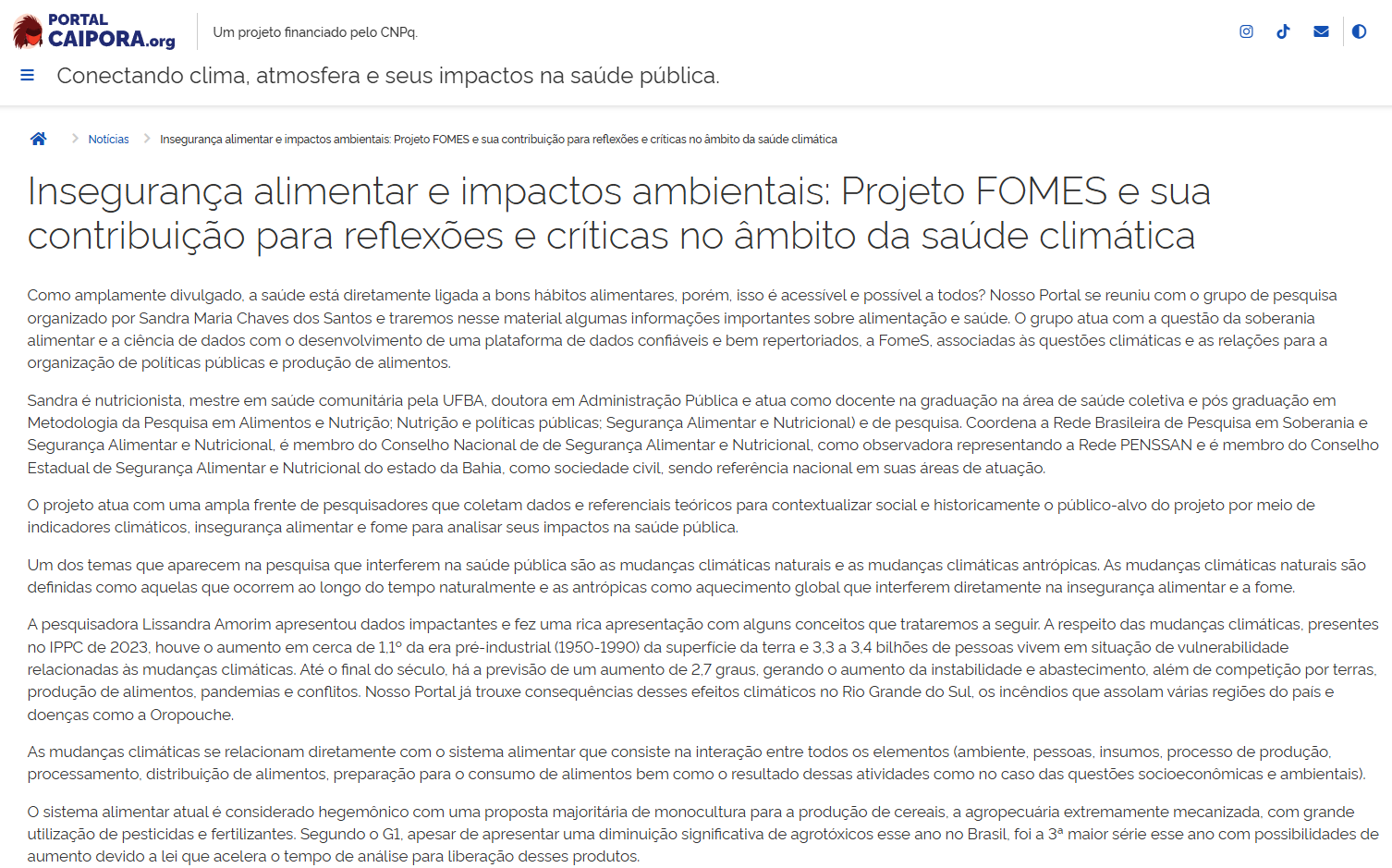 Insegurança alimentar e impactos ambientais: Projeto FOMES e sua contribuição para reflexões e críticas no âmbito da saúde climática